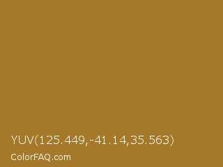 YUV 125.449,-41.14,35.563 Color is a normal orange color and the nearest color is Luxor Gold #a7882c. Hex code #a6792a and RGB value is rgb(166,121,42). In RGB color space, this color is composed of 65% red, 47% green, 16% blue, In CMYK color space, this color is composed of 0% cyan, 27% magenta, 75% yellow , 35% black , In HSL color space, this color has a hue angle of 38° , 60% saturation and 41% lightness.