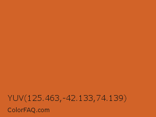 YUV 125.463,-42.133,74.139 Color is a normal orange color and the nearest color is Piper #c96323. Hex code #d26328 and RGB value is rgb(210,99,40). In RGB color space, this color is composed of 82% red, 39% green, 16% blue, In CMYK color space, this color is composed of 0% cyan, 53% magenta, 81% yellow , 18% black , In HSL color space, this color has a hue angle of 21° , 68% saturation and 49% lightness.
