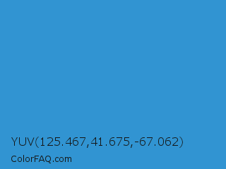 YUV 125.467,41.675,-67.062 Color is a normal blue color and the nearest color is Curious Blue #2596d1. Hex code #3194d2 and RGB value is rgb(49,148,210). In RGB color space, this color is composed of 19% red, 58% green, 82% blue, In CMYK color space, this color is composed of 77% cyan, 30% magenta, 0% yellow , 18% black , In HSL color space, this color has a hue angle of 203° , 64% saturation and 51% lightness.