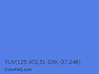 YUV 125.472,51.039,-37.248 Color is a light blue color and the nearest color is Blueberry #4f86f7. Hex code #537fe5 and RGB value is rgb(83,127,229). In RGB color space, this color is composed of 33% red, 50% green, 90% blue, In CMYK color space, this color is composed of 64% cyan, 45% magenta, 0% yellow , 10% black , In HSL color space, this color has a hue angle of 222° , 74% saturation and 61% lightness.