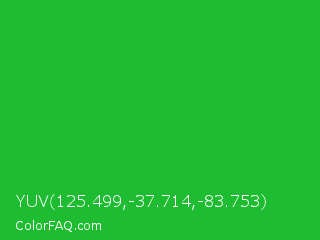 YUV 125.499,-37.714,-83.753 Color is a normal green color and the nearest color is Wageningen Green #34b233. Hex code #1ebd31 and RGB value is rgb(30,189,49). In RGB color space, this color is composed of 12% red, 74% green, 19% blue, In CMYK color space, this color is composed of 84% cyan, 0% magenta, 74% yellow , 26% black , In HSL color space, this color has a hue angle of 127° , 73% saturation and 43% lightness.