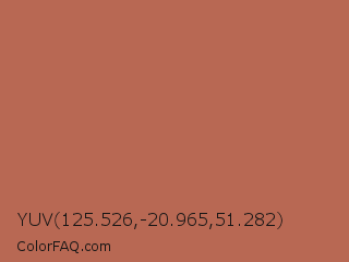 YUV 125.526,-20.965,51.282 Color is a normal red color and the nearest color is Santa Fe #b16d52. Hex code #b86853 and RGB value is rgb(184,104,83). In RGB color space, this color is composed of 72% red, 41% green, 33% blue, In CMYK color space, this color is composed of 0% cyan, 43% magenta, 55% yellow , 28% black , In HSL color space, this color has a hue angle of 12° , 42% saturation and 52% lightness.