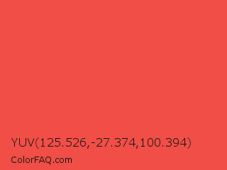 YUV 125.526,-27.374,100.394 Color is a light red color and the nearest color is Carmine Pink #eb4c42. Hex code #f04e46 and RGB value is rgb(240,78,70). In RGB color space, this color is composed of 94% red, 31% green, 27% blue, In CMYK color space, this color is composed of 0% cyan, 68% magenta, 71% yellow , 6% black , In HSL color space, this color has a hue angle of 3° , 85% saturation and 61% lightness.