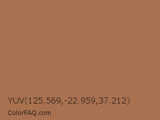 YUV 125.569,-22.959,37.212 Color is a normal orange color and the nearest color is Brown Sugar #af6e4d. Hex code #a8714f and RGB value is rgb(168,113,79). In RGB color space, this color is composed of 66% red, 44% green, 31% blue, In CMYK color space, this color is composed of 0% cyan, 33% magenta, 53% yellow , 34% black , In HSL color space, this color has a hue angle of 23° , 36% saturation and 48% lightness.