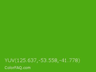 YUV 125.637,-53.558,-41.778 Color is a normal green color and the nearest color is Kelly Green #4cbb17. Hex code #4eab11 and RGB value is rgb(78,171,17). In RGB color space, this color is composed of 31% red, 67% green, 7% blue, In CMYK color space, this color is composed of 54% cyan, 0% magenta, 90% yellow , 33% black , In HSL color space, this color has a hue angle of 96° , 82% saturation and 37% lightness.