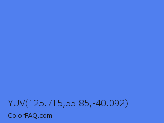 YUV 125.715,55.85,-40.092 Color is a light blue color and the nearest color is Blueberry #4f86f7. Hex code #507fef and RGB value is rgb(80,127,239). In RGB color space, this color is composed of 31% red, 50% green, 94% blue, In CMYK color space, this color is composed of 67% cyan, 47% magenta, 0% yellow , 6% black , In HSL color space, this color has a hue angle of 222° , 83% saturation and 63% lightness.