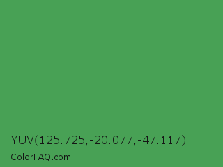 YUV 125.725,-20.077,-47.117 Color is a normal green color and the nearest color is Fruit Salad #4f9d5d. Hex code #48a155 and RGB value is rgb(72,161,85). In RGB color space, this color is composed of 28% red, 63% green, 33% blue, In CMYK color space, this color is composed of 55% cyan, 0% magenta, 47% yellow , 37% black , In HSL color space, this color has a hue angle of 129° , 38% saturation and 46% lightness.