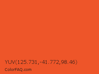 YUV 125.731,-41.772,98.46 Color is a normal red color and the nearest color is Flamingo #f2552a. Hex code #ee5529 and RGB value is rgb(238,85,41). In RGB color space, this color is composed of 93% red, 33% green, 16% blue, In CMYK color space, this color is composed of 0% cyan, 64% magenta, 83% yellow , 7% black , In HSL color space, this color has a hue angle of 13° , 85% saturation and 55% lightness.