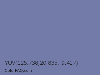YUV 125.738,20.835,-9.417 Color is a normal blue color and the nearest color is Shadow Blue #778ba5. Hex code #737ba8 and RGB value is rgb(115,123,168). In RGB color space, this color is composed of 45% red, 48% green, 66% blue, In CMYK color space, this color is composed of 32% cyan, 27% magenta, 0% yellow , 34% black , In HSL color space, this color has a hue angle of 231° , 23% saturation and 55% lightness.