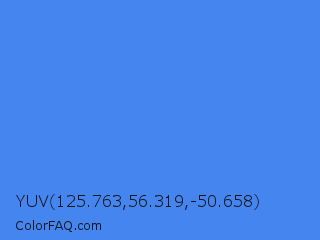 YUV 125.763,56.319,-50.658 Color is a normal blue color and the nearest color is Blueberry #4f86f7. Hex code #4485f0 and RGB value is rgb(68,133,240). In RGB color space, this color is composed of 27% red, 52% green, 94% blue, In CMYK color space, this color is composed of 72% cyan, 45% magenta, 0% yellow , 6% black , In HSL color space, this color has a hue angle of 217° , 85% saturation and 60% lightness.