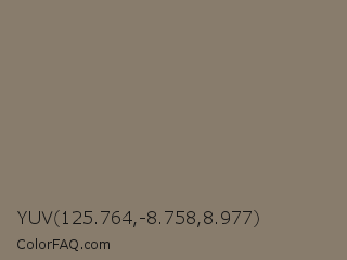 YUV 125.764,-8.758,8.977 Color is a normal orange color and the nearest color is Makara #897d6d. Hex code #887c6c and RGB value is rgb(136,124,108). In RGB color space, this color is composed of 53% red, 49% green, 42% blue, In CMYK color space, this color is composed of 0% cyan, 9% magenta, 21% yellow , 47% black , In HSL color space, this color has a hue angle of 34° , 11% saturation and 48% lightness.