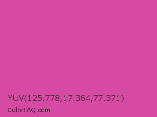 YUV 125.778,17.364,77.371 Color is a normal magenta color and the nearest color is Pink Pantone #d74894. Hex code #d64aa1 and RGB value is rgb(214,74,161). In RGB color space, this color is composed of 84% red, 29% green, 63% blue, In CMYK color space, this color is composed of 0% cyan, 65% magenta, 25% yellow , 16% black , In HSL color space, this color has a hue angle of 323° , 63% saturation and 56% lightness.