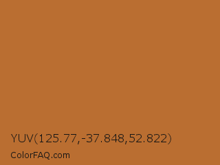 YUV 125.77,-37.848,52.822 Color is a normal orange color and the nearest color is Copper #b87333. Hex code #ba6e31 and RGB value is rgb(186,110,49). In RGB color space, this color is composed of 73% red, 43% green, 19% blue, In CMYK color space, this color is composed of 0% cyan, 41% magenta, 74% yellow , 27% black , In HSL color space, this color has a hue angle of 27° , 58% saturation and 46% lightness.