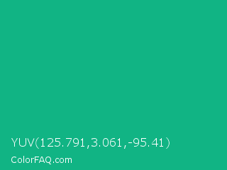 YUV 125.791,3.061,-95.41 Color is a normal green color and the nearest color is Mountain Meadow Crayola #1ab385. Hex code #11b484 and RGB value is rgb(17,180,132). In RGB color space, this color is composed of 7% red, 71% green, 52% blue, In CMYK color space, this color is composed of 91% cyan, 0% magenta, 27% yellow , 29% black , In HSL color space, this color has a hue angle of 162° , 83% saturation and 39% lightness.
