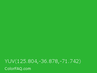 YUV 125.804,-36.878,-71.742 Color is a normal green color and the nearest color is Wageningen Green #34b233. Hex code #2cb633 and RGB value is rgb(44,182,51). In RGB color space, this color is composed of 17% red, 71% green, 20% blue, In CMYK color space, this color is composed of 76% cyan, 0% magenta, 72% yellow , 29% black , In HSL color space, this color has a hue angle of 123° , 61% saturation and 44% lightness.