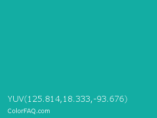 YUV 125.814,18.333,-93.676 Color is a normal cyan color and the nearest color is Light Sea Green #20b2aa. Hex code #13ada3 and RGB value is rgb(19,173,163). In RGB color space, this color is composed of 7% red, 68% green, 64% blue, In CMYK color space, this color is composed of 89% cyan, 0% magenta, 6% yellow , 32% black , In HSL color space, this color has a hue angle of 176° , 80% saturation and 38% lightness.