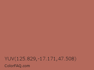 YUV 125.829,-17.171,47.508 Color is a normal red color and the nearest color is Santa Fe #b16d52. Hex code #b4695b and RGB value is rgb(180,105,91). In RGB color space, this color is composed of 71% red, 41% green, 36% blue, In CMYK color space, this color is composed of 0% cyan, 42% magenta, 49% yellow , 29% black , In HSL color space, this color has a hue angle of 9° , 37% saturation and 53% lightness.