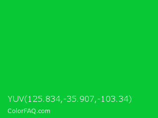 YUV 125.834,-35.907,-103.34 Color is a normal green color and the nearest color is Vivid Malachite #00cc33. Hex code #08c835 and RGB value is rgb(8,200,53). In RGB color space, this color is composed of 3% red, 78% green, 21% blue, In CMYK color space, this color is composed of 96% cyan, 0% magenta, 74% yellow , 22% black , In HSL color space, this color has a hue angle of 134° , 92% saturation and 41% lightness.
