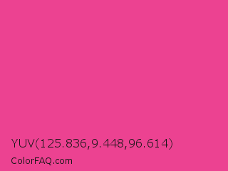 YUV 125.836,9.448,96.614 Color is a normal rose color and the nearest color is Violet Red #f7468a. Hex code #ec4291 and RGB value is rgb(236,66,145). In RGB color space, this color is composed of 93% red, 26% green, 57% blue, In CMYK color space, this color is composed of 0% cyan, 72% magenta, 39% yellow , 7% black , In HSL color space, this color has a hue angle of 332° , 82% saturation and 59% lightness.
