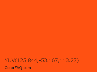 YUV 125.844,-53.167,113.27 Color is a normal orange color and the nearest color is Orioles Orange #fb4f14. Hex code #ff5112 and RGB value is rgb(255,81,18). In RGB color space, this color is composed of 100% red, 32% green, 7% blue, In CMYK color space, this color is composed of 0% cyan, 68% magenta, 93% yellow , 0% black , In HSL color space, this color has a hue angle of 16° , 100% saturation and 54% lightness.