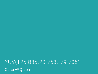 YUV 125.885,20.763,-79.706 Color is a normal cyan color and the nearest color is Eastern Blue #1e9ab0. Hex code #23a4a8 and RGB value is rgb(35,164,168). In RGB color space, this color is composed of 14% red, 64% green, 66% blue, In CMYK color space, this color is composed of 79% cyan, 2% magenta, 0% yellow , 34% black , In HSL color space, this color has a hue angle of 182° , 66% saturation and 40% lightness.
