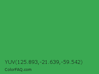 YUV 125.893,-21.639,-59.542 Color is a normal green color and the nearest color is Chateau Green #40a860. Hex code #3aa952 and RGB value is rgb(58,169,82). In RGB color space, this color is composed of 23% red, 66% green, 32% blue, In CMYK color space, this color is composed of 66% cyan, 0% magenta, 51% yellow , 34% black , In HSL color space, this color has a hue angle of 133° , 49% saturation and 45% lightness.