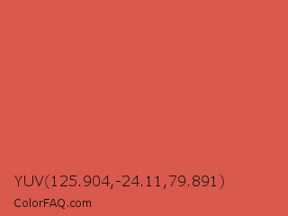 YUV 125.904,-24.11,79.891 Color is a normal red color and the nearest color is Jelly Bean #da614e. Hex code #d9594d and RGB value is rgb(217,89,77). In RGB color space, this color is composed of 85% red, 35% green, 30% blue, In CMYK color space, this color is composed of 0% cyan, 59% magenta, 65% yellow , 15% black , In HSL color space, this color has a hue angle of 5° , 65% saturation and 58% lightness.