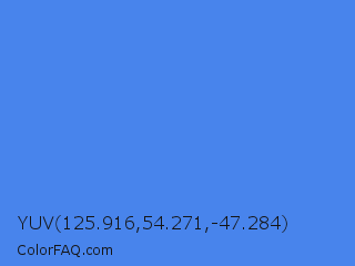 YUV 125.916,54.271,-47.284 Color is a normal blue color and the nearest color is Blueberry #4f86f7. Hex code #4884ec and RGB value is rgb(72,132,236). In RGB color space, this color is composed of 28% red, 52% green, 93% blue, In CMYK color space, this color is composed of 69% cyan, 44% magenta, 0% yellow , 7% black , In HSL color space, this color has a hue angle of 218° , 81% saturation and 60% lightness.