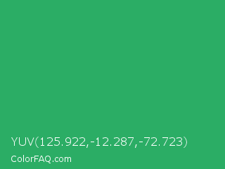 YUV 125.922,-12.287,-72.723 Color is a normal green color and the nearest color is Medium Sea Green #3cb371. Hex code #2bad65 and RGB value is rgb(43,173,101). In RGB color space, this color is composed of 17% red, 68% green, 40% blue, In CMYK color space, this color is composed of 75% cyan, 0% magenta, 42% yellow , 32% black , In HSL color space, this color has a hue angle of 147° , 60% saturation and 42% lightness.