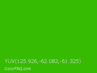 YUV 125.926,-62.082,-61.325 Color is a normal green color and the nearest color is Kelly Green #4cbb17. Hex code #38ba00 and RGB value is rgb(56,186,-0). In RGB color space, this color is composed of 22% red, 73% green, 0% blue, In CMYK color space, this color is composed of 70% cyan, 0% magenta, 100% yellow , 27% black , In HSL color space, this color has a hue angle of 102° , 100% saturation and 36% lightness.