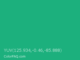 YUV 125.934,-0.46,-85.888 Color is a normal green color and the nearest color is Green Crayola #1cac78. Hex code #1cb07d and RGB value is rgb(28,176,125). In RGB color space, this color is composed of 11% red, 69% green, 49% blue, In CMYK color space, this color is composed of 84% cyan, 0% magenta, 29% yellow , 31% black , In HSL color space, this color has a hue angle of 159° , 73% saturation and 40% lightness.