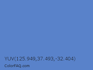 YUV 125.949,37.493,-32.404 Color is a normal blue color and the nearest color is Silver Lake Blue #5d89ba. Hex code #5982ca and RGB value is rgb(89,130,202). In RGB color space, this color is composed of 35% red, 51% green, 79% blue, In CMYK color space, this color is composed of 56% cyan, 36% magenta, 0% yellow , 21% black , In HSL color space, this color has a hue angle of 218° , 52% saturation and 57% lightness.