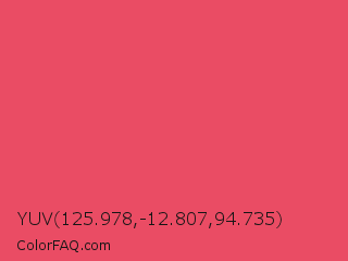 YUV 125.978,-12.807,94.735 Color is a light red color and the nearest color is Mandy #e25465. Hex code #ea4c64 and RGB value is rgb(234,76,100). In RGB color space, this color is composed of 92% red, 30% green, 39% blue, In CMYK color space, this color is composed of 0% cyan, 68% magenta, 57% yellow , 8% black , In HSL color space, this color has a hue angle of 351° , 79% saturation and 61% lightness.