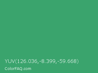YUV 126.036,-8.399,-59.668 Color is a normal green color and the nearest color is Ocean Green #41aa78. Hex code #3aa46d and RGB value is rgb(58,164,109). In RGB color space, this color is composed of 23% red, 64% green, 43% blue, In CMYK color space, this color is composed of 65% cyan, 0% magenta, 34% yellow , 36% black , In HSL color space, this color has a hue angle of 149° , 48% saturation and 44% lightness.