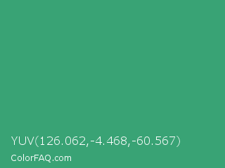YUV 126.062,-4.468,-60.567 Color is a normal green color and the nearest color is Ocean Green #41aa78. Hex code #39a375 and RGB value is rgb(57,163,117). In RGB color space, this color is composed of 22% red, 64% green, 46% blue, In CMYK color space, this color is composed of 65% cyan, 0% magenta, 28% yellow , 36% black , In HSL color space, this color has a hue angle of 154° , 48% saturation and 43% lightness.