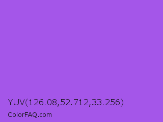 YUV 126.08,52.712,33.256 Color is a light purple color and the nearest color is Navy Purple #9457eb. Hex code #a456e9 and RGB value is rgb(164,86,233). In RGB color space, this color is composed of 64% red, 34% green, 91% blue, In CMYK color space, this color is composed of 30% cyan, 63% magenta, 0% yellow , 9% black , In HSL color space, this color has a hue angle of 272° , 77% saturation and 63% lightness.