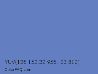 YUV 126.152,32.956,-23.812 Color is a normal blue color and the nearest color is Glaucous #6082b6. Hex code #637fc1 and RGB value is rgb(99,127,193). In RGB color space, this color is composed of 39% red, 50% green, 76% blue, In CMYK color space, this color is composed of 49% cyan, 34% magenta, 0% yellow , 24% black , In HSL color space, this color has a hue angle of 222° , 43% saturation and 57% lightness.
