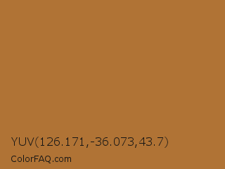 YUV 126.171,-36.073,43.7 Color is a normal orange color and the nearest color is Copper #b87333. Hex code #b07335 and RGB value is rgb(176,115,53). In RGB color space, this color is composed of 69% red, 45% green, 21% blue, In CMYK color space, this color is composed of 0% cyan, 35% magenta, 70% yellow , 31% black , In HSL color space, this color has a hue angle of 30° , 54% saturation and 45% lightness.
