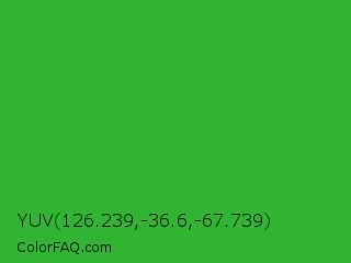 YUV 126.239,-36.6,-67.739 Color is a normal green color and the nearest color is Wageningen Green #34b233. Hex code #31b434 and RGB value is rgb(49,180,52). In RGB color space, this color is composed of 19% red, 71% green, 20% blue, In CMYK color space, this color is composed of 73% cyan, 0% magenta, 71% yellow , 29% black , In HSL color space, this color has a hue angle of 121° , 57% saturation and 45% lightness.
