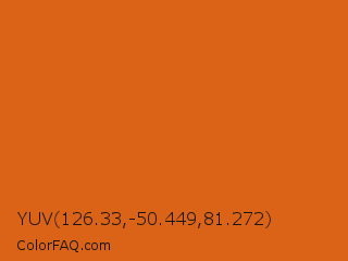 YUV 126.33,-50.449,81.272 Color is a normal orange color and the nearest color is Hot Cinnamon #d2691e. Hex code #db6318 and RGB value is rgb(219,99,24). In RGB color space, this color is composed of 86% red, 39% green, 9% blue, In CMYK color space, this color is composed of 0% cyan, 55% magenta, 89% yellow , 14% black , In HSL color space, this color has a hue angle of 23° , 80% saturation and 48% lightness.