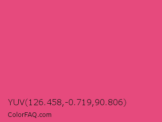YUV 126.458,-0.719,90.806 Color is a normal rose color and the nearest color is Dark Pink #e75480. Hex code #e64a7d and RGB value is rgb(230,74,125). In RGB color space, this color is composed of 90% red, 29% green, 49% blue, In CMYK color space, this color is composed of 0% cyan, 68% magenta, 46% yellow , 10% black , In HSL color space, this color has a hue angle of 340° , 76% saturation and 60% lightness.
