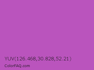 YUV 126.468,30.828,52.21 Color is a normal magenta color and the nearest color is Fuchsia Pink #c154c1. Hex code #ba54bd and RGB value is rgb(186,84,189). In RGB color space, this color is composed of 73% red, 33% green, 74% blue, In CMYK color space, this color is composed of 2% cyan, 56% magenta, 0% yellow , 26% black , In HSL color space, this color has a hue angle of 298° , 44% saturation and 54% lightness.