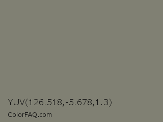 YUV 126.518,-5.678,1.3 Color is a normal yellow color and the nearest color is Friar Gray #807e79. Hex code #808073 and RGB value is rgb(128,128,115). In RGB color space, this color is composed of 50% red, 50% green, 45% blue, In CMYK color space, this color is composed of 0% cyan, 0% magenta, 10% yellow , 50% black , In HSL color space, this color has a hue angle of 60° , 5% saturation and 48% lightness.