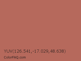 YUV 126.541,-17.029,48.638 Color is a normal red color and the nearest color is Santa Fe #b16d52. Hex code #b6695c and RGB value is rgb(182,105,92). In RGB color space, this color is composed of 71% red, 41% green, 36% blue, In CMYK color space, this color is composed of 0% cyan, 42% magenta, 49% yellow , 29% black , In HSL color space, this color has a hue angle of 9° , 38% saturation and 54% lightness.