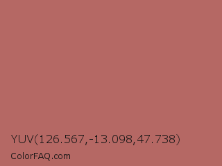 YUV 126.567,-13.098,47.738 Color is a normal red color and the nearest color is Copper Penny #ad6f69. Hex code #b56864 and RGB value is rgb(181,104,100). In RGB color space, this color is composed of 71% red, 41% green, 39% blue, In CMYK color space, this color is composed of 0% cyan, 43% magenta, 45% yellow , 29% black , In HSL color space, this color has a hue angle of 3° , 35% saturation and 55% lightness.