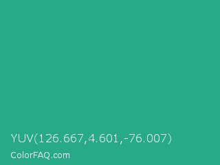 YUV 126.667,4.601,-76.007 Color is a normal cyan color and the nearest color is Jungle Green #29ab87. Hex code #28a988 and RGB value is rgb(40,169,136). In RGB color space, this color is composed of 16% red, 66% green, 53% blue, In CMYK color space, this color is composed of 76% cyan, 0% magenta, 20% yellow , 34% black , In HSL color space, this color has a hue angle of 165° , 62% saturation and 41% lightness.