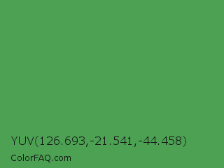 YUV 126.693,-21.541,-44.458 Color is a normal green color and the nearest color is Fruit Salad #4f9d5d. Hex code #4ca153 and RGB value is rgb(76,161,83). In RGB color space, this color is composed of 30% red, 63% green, 33% blue, In CMYK color space, this color is composed of 53% cyan, 0% magenta, 48% yellow , 37% black , In HSL color space, this color has a hue angle of 125° , 36% saturation and 46% lightness.
