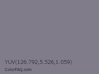 YUV 126.792,5.526,1.059 Color is a normal indigo color and the nearest color is Topaz #7c778a. Hex code #807c8a and RGB value is rgb(128,124,138). In RGB color space, this color is composed of 50% red, 49% green, 54% blue, In CMYK color space, this color is composed of 7% cyan, 10% magenta, 0% yellow , 46% black , In HSL color space, this color has a hue angle of 257° , 6% saturation and 51% lightness.