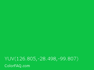 YUV 126.805,-28.498,-99.807 Color is a normal green color and the nearest color is Dark Pastel Green #03c03c. Hex code #0dc445 and RGB value is rgb(13,196,69). In RGB color space, this color is composed of 5% red, 77% green, 27% blue, In CMYK color space, this color is composed of 93% cyan, 0% magenta, 65% yellow , 23% black , In HSL color space, this color has a hue angle of 138° , 88% saturation and 41% lightness.