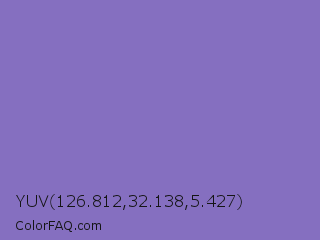 YUV 126.812,32.138,5.427 Color is a normal indigo color and the nearest color is Middle Blue Purple #8b72be. Hex code #856fc0 and RGB value is rgb(133,111,192). In RGB color space, this color is composed of 52% red, 44% green, 75% blue, In CMYK color space, this color is composed of 31% cyan, 42% magenta, 0% yellow , 25% black , In HSL color space, this color has a hue angle of 256° , 39% saturation and 59% lightness.